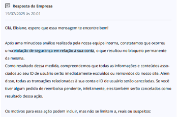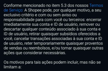 Motivo genérico usado para suspender, banir ou congelar contas, sem explicar a suposta infração. Mesmo após contestar, a resposta da plataforma é vaga e mantém o bloqueio.